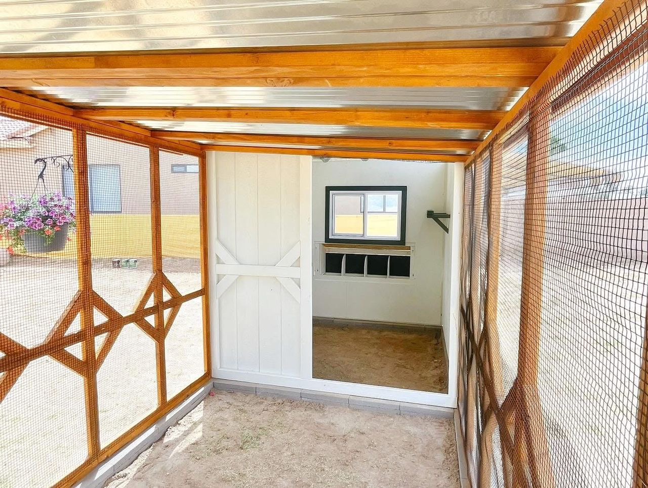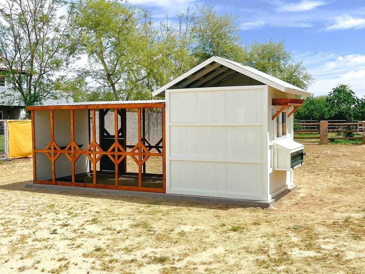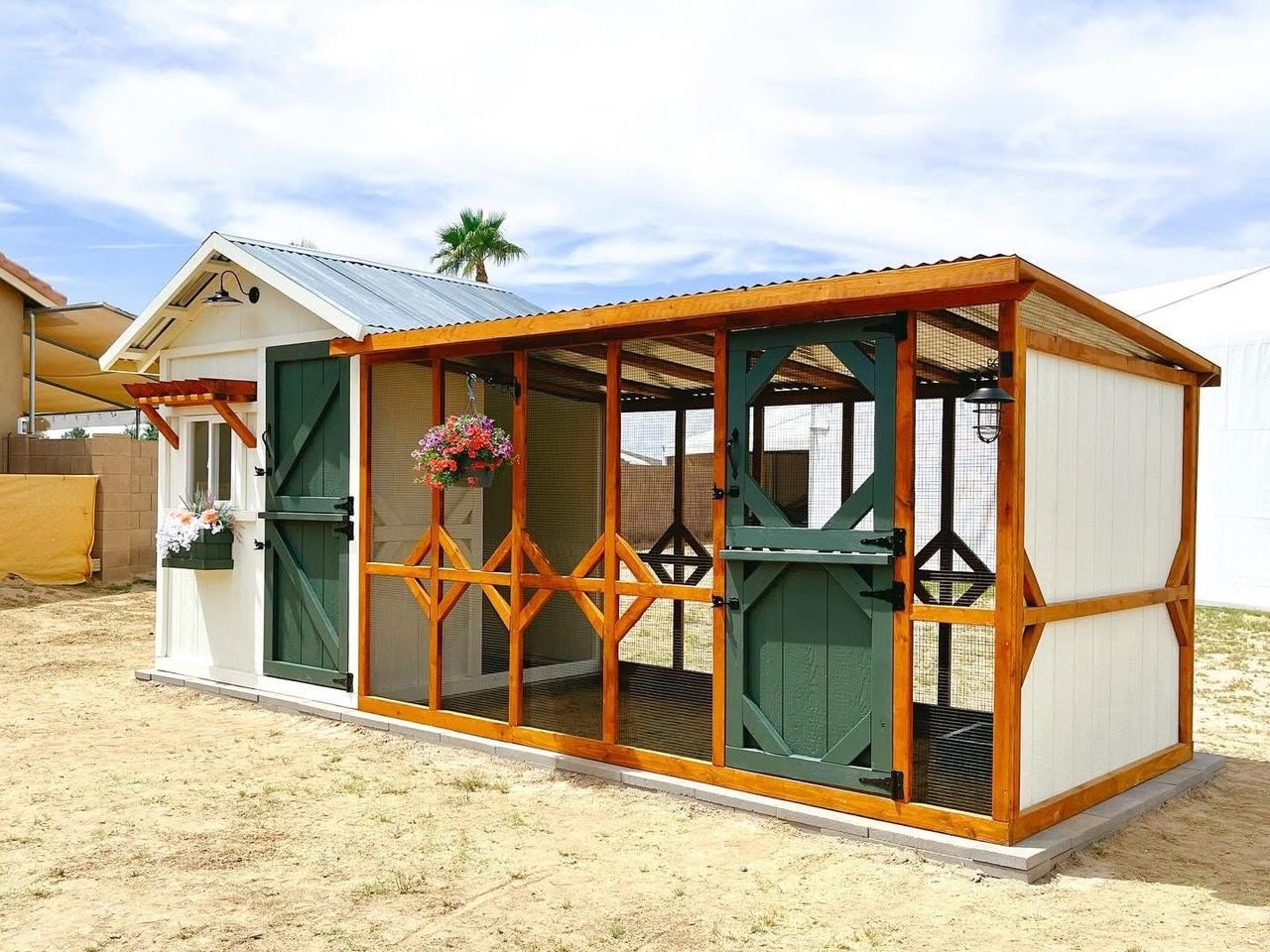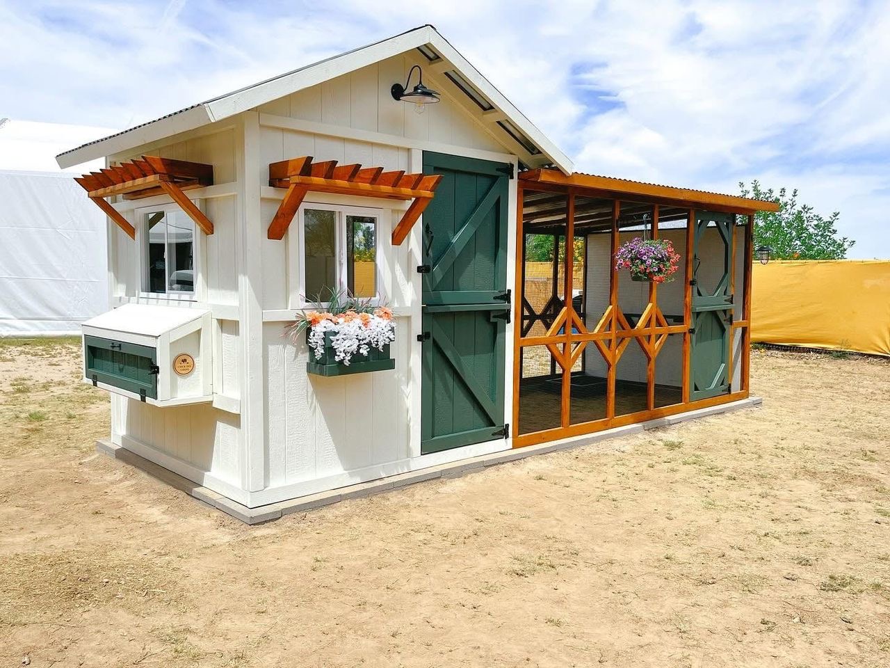 Beautifully handcrafted Luxury Cottage Chicken Coop combines charming farmhouse aesthetics with practical features to keep your flock safe, comfortable, and happy. Made from durable wood and mesh with a weather-resistant metal roof, it includes a spacious walk-in run, secure Dutch-style doors, and an elevated nesting box with easy access for egg collection. Thoughtful details like roost bars, flower boxes, ventilation windows, and clean-out panels make it both functional and attractive. With enough space for 6–10 chickens, it’s the perfect blend of style, safety, and convenience for any backyard.